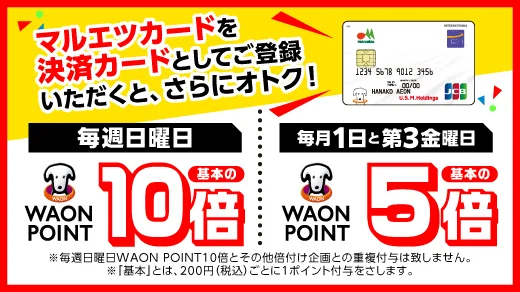 特典など | マルエツカードでの支払いで ①毎週日曜日WAON POINT10倍 ②毎月1日と第3金曜日WAON POINT5倍 ③いつでもWAON POINT3倍 ④お買い物金額200円(税込)につき1WAON POINT加算 |